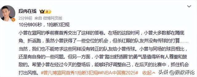 篮网主帅谈曾凡博首秀难以评价引热议 媒体人吐槽“不通人情”
